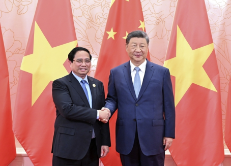 8月31日下午,国家主席习近平在天津迎宾馆会见来华出席2025年上海合作组织峰会的越南总理范明政。新华社记者 燕雁 摄