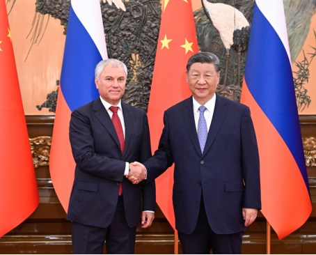 8月26日上午,国家主席习近平在北京人民大会堂会见俄罗斯国家杜马主席沃洛金。新华社记者 申宏 摄