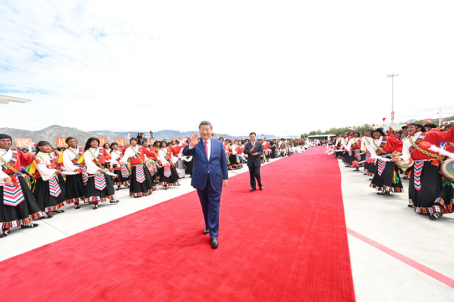 习近平离开西藏时,各族群众纷纷来到拉萨市区的沿途道路两旁,挥舞红旗、手捧哈达,欢呼着向总书记问好,向总书记表达由衷的爱戴。拉萨贡嘎机场,身着节日盛装的干部群众挥舞着红旗和花束,载歌载舞,高喊“扎西德勒”,表达高原儿女对以习近平同志为核心的党中央的感激之情、对建设社会主义现代化新西藏的坚定信心。