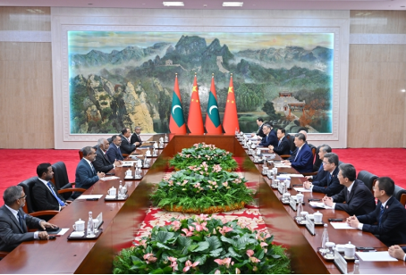 8月31日上午,国家主席习近平在天津迎宾馆会见来华出席2025年上海合作组织峰会和纪念中国人民抗日战争暨世界反法西斯战争胜利80周年活动的马尔代夫总统穆伊兹。新华社记者 岳月伟 摄