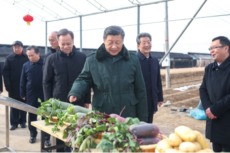 2月1日至2日,中共中央总书记、国家主席、中央军委主席习近平来到天津,看望慰问基层干部群众。这是1日上午,习近平在西青区辛口镇第六埠村实地察看去年洪涝灾害后当地农业生产恢复等情况时,走进大棚看蔬菜长势。新华社记者 燕雁 摄