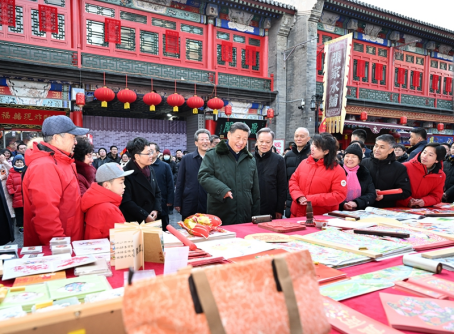 当天下午,习近平来到天津古文化街。街道古色古香,习近平沿街步行,先后走进桂发祥十八街麻花、果仁张、泥人张、杨柳青年画等特色店铺,了解产品种类、销售和传统文化传承发展等情况,同店铺业主、员工和现场群众互动交流。他说,各级党委和政府要加强节日期间民生商品的产销保供,确保数量充足、品类丰富、质量可靠,让广大群众放心消费、快乐过年。习近平指出,中国式现代化离不开优秀传统文化的继承和弘扬,天津是一座很有特色和韵味的城市,要保护和利用好历史文化街区,使其在现代化大都市建设中绽放异彩。