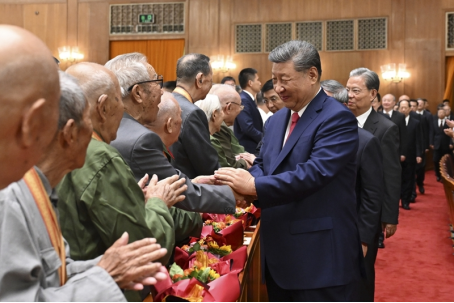 19时55分许,欢快的迎宾曲响起,习近平等领导同志步入大礼堂,同抗战老战士老同志代表亲切握手。