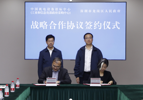 10月23日,中国机电设备招标中心(工业和信息化部政府采购中心)与深圳市龙岗区人民政府在京举行战略合作协议签约仪式暨创新发展座谈会。招标中心党委书记毛强、副主任刘华鲁,龙岗区委书记余锡权、区政府副区长平原、团区委书记卢喜群、区工业和信息化局副局长邱少雄等出席会议。